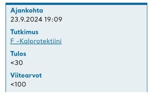 “Mun vatsan tulehdusarvo calpro on ollut jopa 9000. Ennen hoidossa käyntiä olin saanut kortisonikuurin ja tuon kuurin jälkeen arvo oli 1900 ja arvo alkoi nousta ylöspäin lääkkeistä huolimatta.”